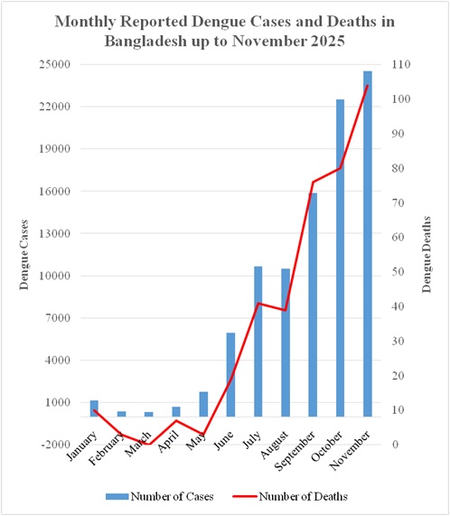 Since 2023, data from the Directorate General of Health Services (DGHS) show that Bangladesh has recorded more than half a million dengue infections, with nearly 2,700 lives lost. The scale of the crisis became starkly apparent in 2023, when over 321,000 people were infected and 1,705 died—more than twice the total deaths recorded between 2000 and 2022 combined—ranking Bangladesh third worldwide in the number of dengue cases.The human cost is escalating alongside systemic failures. Bangladesh is facing an unprecedented dengue emergency. Hospitalizations nearly quadrupled between June and October 2025, pushing an already strained health system to the brink, while dengue deaths surged by 150% YOY by September. The crisis peaked in November. On 18 November alone, hospitals were overwhelmed by more than 900 viral fever patients alongside nearly 3,000 active dengue cases. By the end of November 2025, over 24,500 infections and 100 deaths had been recorded (Figure 1)—more than a quarter of the year’s total cases and fatalities concentrated in a single, devastating month—according to DGHS dynamic data.
